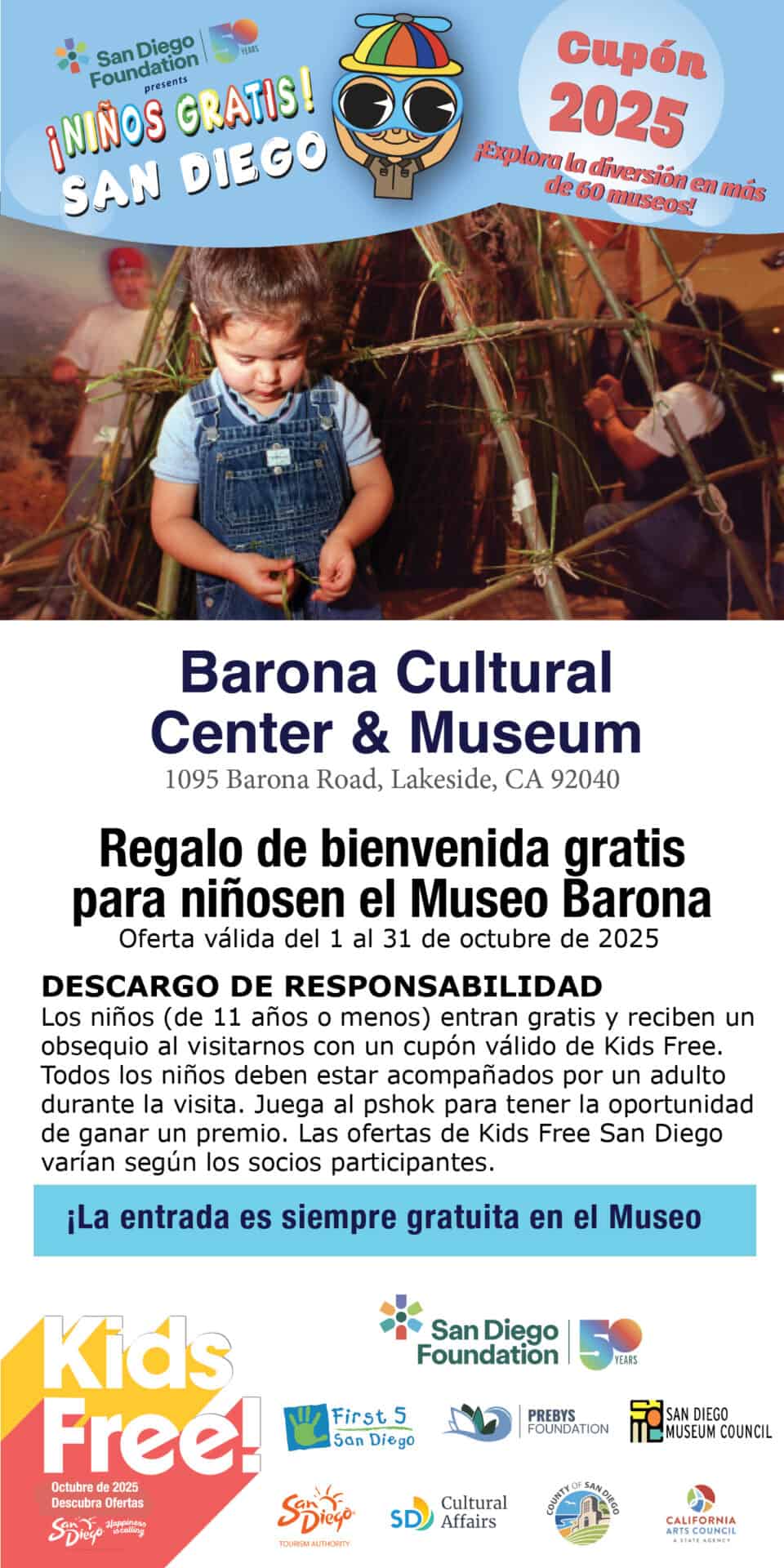 Discover the rich history and living traditions of the Kumeyaay people at the Barona Cultural Center & Museum, located on the Barona Indian Reservation in Lakeside. Admission is always Free, and during October, kids will enjoy special activities designed just for them! Every child who visits will receive a gift, and families can join in a traditional game of pshok for a chance to win a prize. It’s a fun and educational way to experience Native culture together! Download Coupon Here