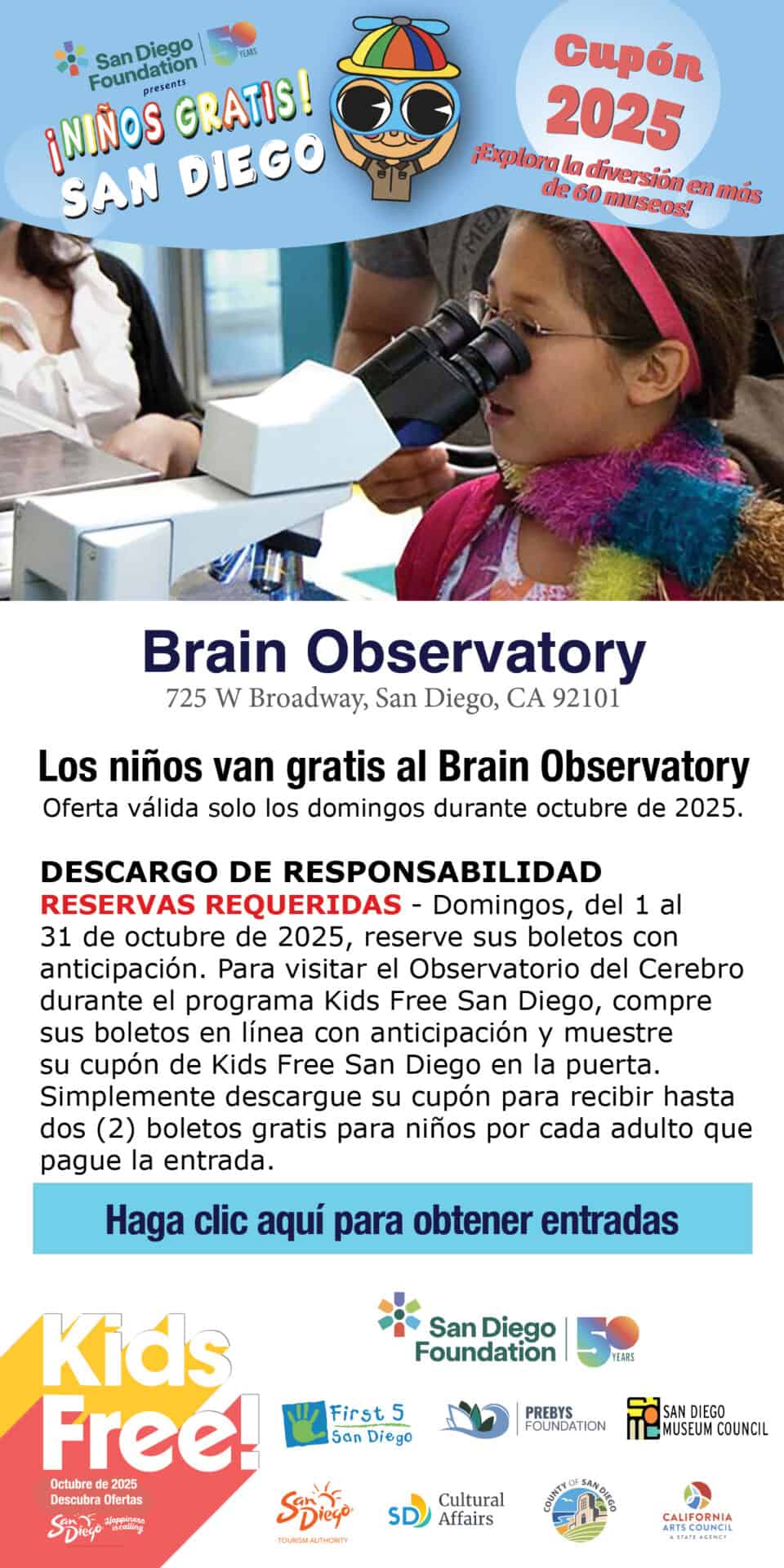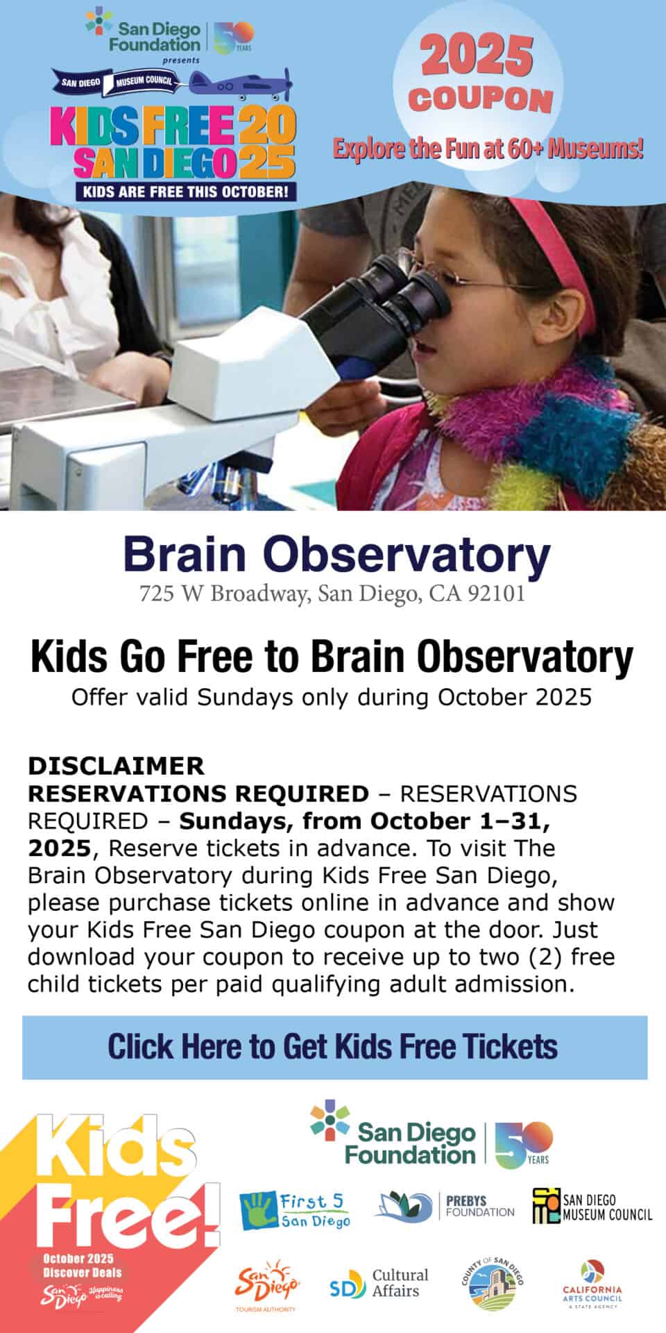 Disclaimer: RESERVATIONS REQUIRED – Valid Sundays, from October 1–31, 2025, Reserve tickets in advance. To visit The Brain Observatory during Kids Free San Diego, please purchase tickets online in advance and show your Kids Free San Diego coupon at the door. Just show your coupon to receive up to two (2) free child tickets per paid qualifying adult admission.