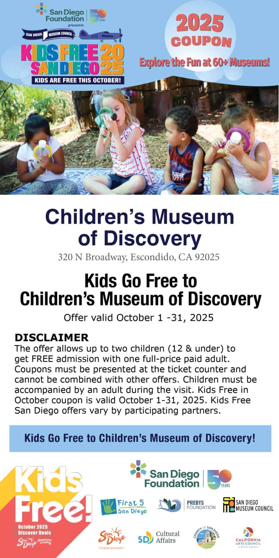 Disclaimer: During October, up to two children (12 and under) receive Free admission with one full-price paid adult. Coupon must be presented at the ticket counter and cannot be combined with other offers. Children must be accompanied by an adult during the visit. Kids Free San Diego offers vary by participating partners.