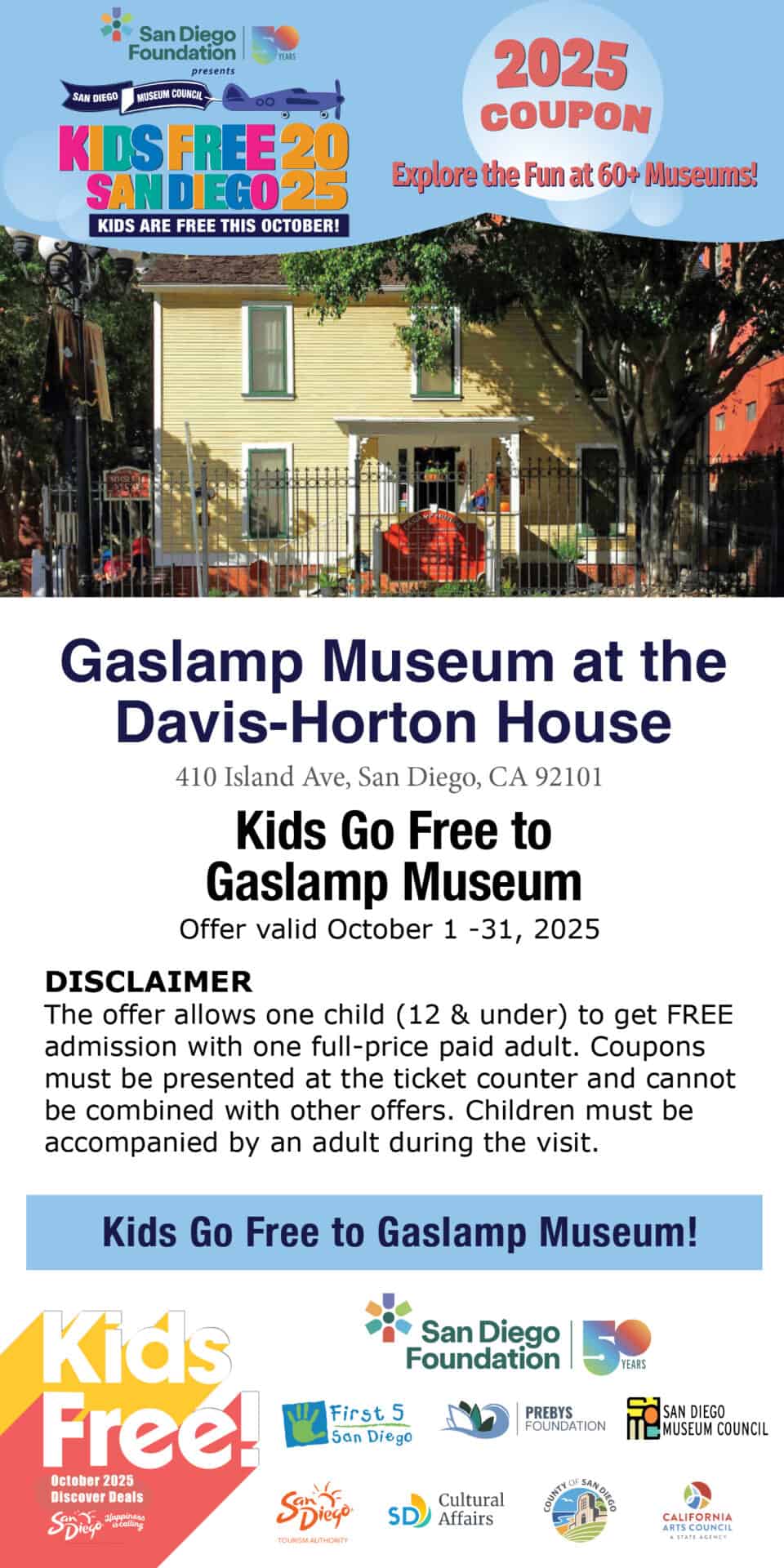 Disclaimer: October 1–31, 2025, one child (12 and under) receives free admission with one full-price paid adult and a valid Kids Free coupon (available at the Redeem Offer link). Coupon must be presented at the ticket counter and cannot be combined with other offers. Children must be accompanied by an adult during the visit. Kids Free San Diego offers vary by participating partners.