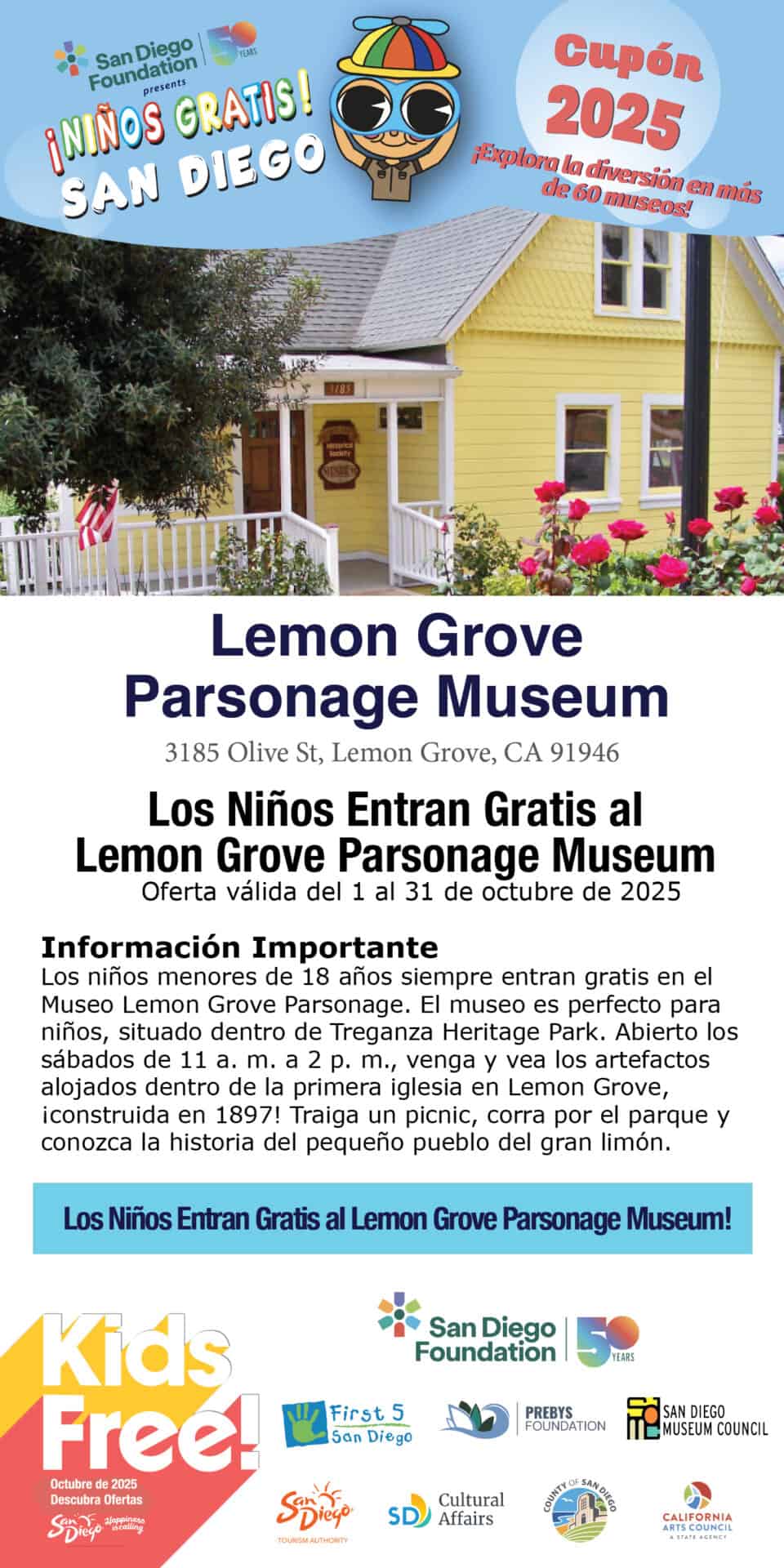 Disclaimer: October 1–31, 2025, kids (18 and under) are always Free at the Lemon Grove Parsonage Museum. Children must be accompanied by an adult during the visit. Kids Free San Diego offers vary by participating partners.