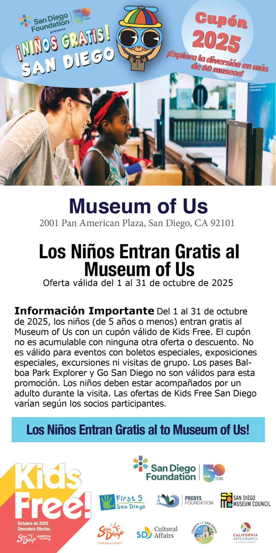 Disclaimer: October 1–31, 2025, kids (5 and under) receive free admission to the Museum of Us with a valid Kids Free coupon. Coupon cannot be combined with any other offer or discount. Not valid for specially ticketed events, special exhibitions/exhibits, field trips, or group visits. Balboa Park Explorer Passes and Go San Diego passes are not valid for this promotion. Children must be accompanied by an adult during the visit. Kids Free San Diego offers vary by participating partners.
