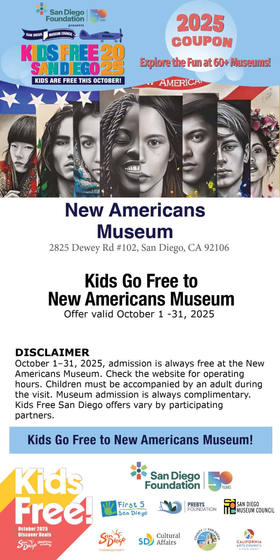 Disclaimer: October 1–31, 2025, admission is always free at the New Americans Museum. Check the website for operating hours. Children must be accompanied by an adult during the visit. Museum admission is always complimentary. Kids Free San Diego offers vary by participating partners.