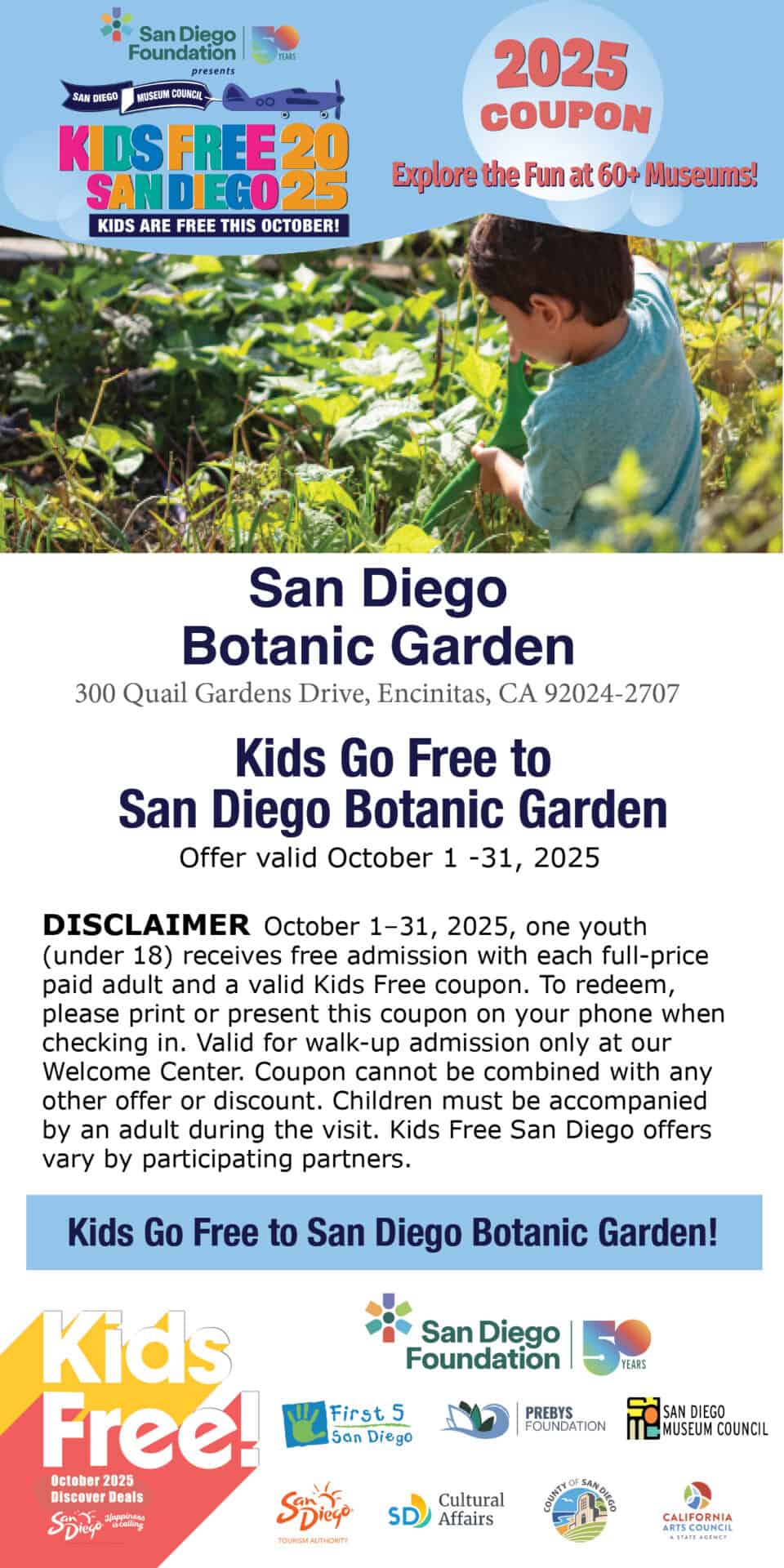 Discover 37 acres of lush gardens, rare plants, and themed landscapes at the San Diego Botanic Garden in Encinitas. Families can explore everything from tropical rainforests and bamboo groves to desert gardens and California native habitats. Kids especially love the interactive Hamilton Children’s Garden and Incredible Edibles Garden, where nature and play come together. During October, one youth (under 18) receives free admission with each paid adult—making it the perfect season for a family adventure outdoors. Download Coupon Here.