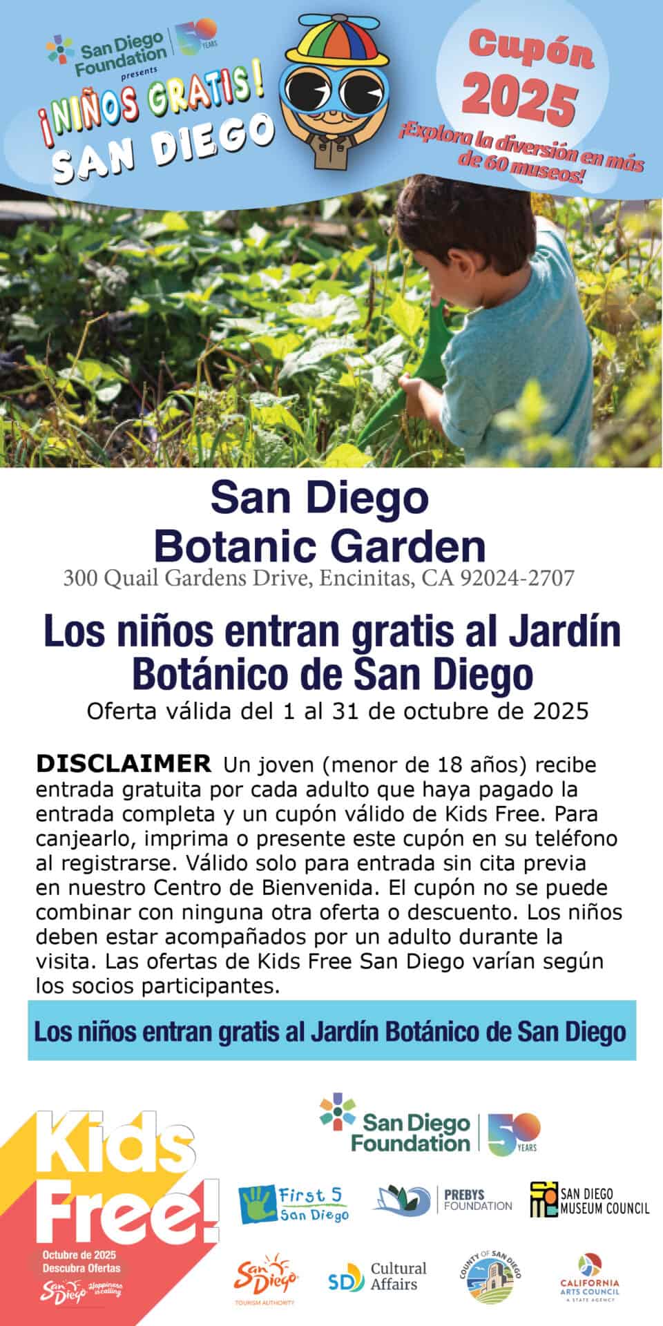 Disclaimer: October 1–31, 2025, one youth (under 18) receives free admission with each full-price paid adult and a valid Kids Free coupon. To redeem, please print or present this coupon on your phone when checking in. Valid for walk-up admission only at our Welcome Center. Coupon cannot be combined with any other offer or discount. Children must be accompanied by an adult during the visit. Kids Free San Diego offers vary by participating partners.