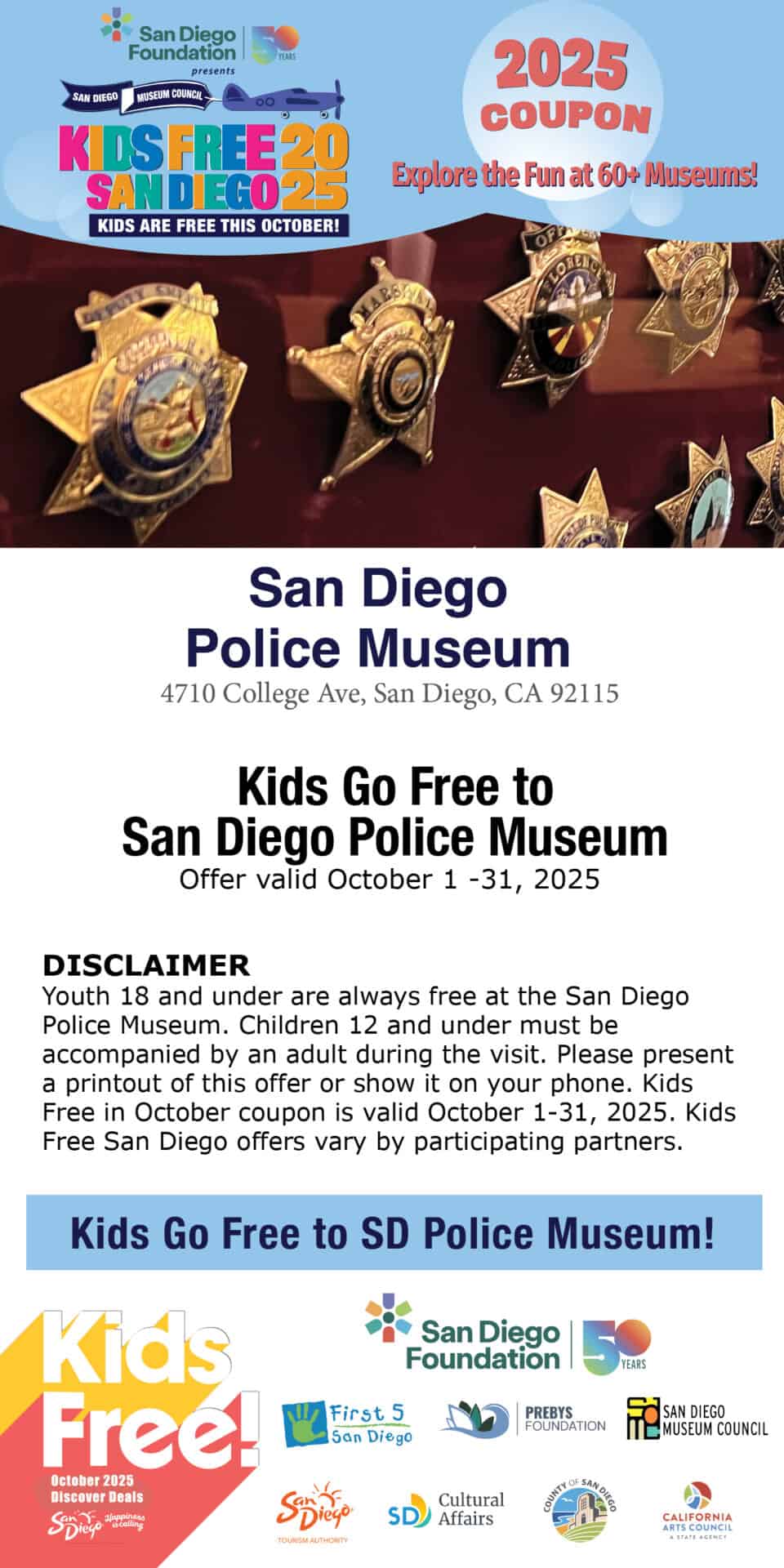 Disclaimer: Youth 18 and under are always Free at the San Diego Police Museum. Children 12 and under must be accompanied by an adult during the visit. Get your Kids Free coupon at the Redeem Offer link. Please present a printout of this offer or show it on your phone. Kids Free in October coupon is valid October 1–31, 2025. Kids Free San Diego offers vary by participating partners.