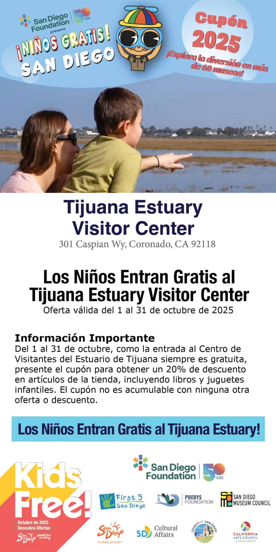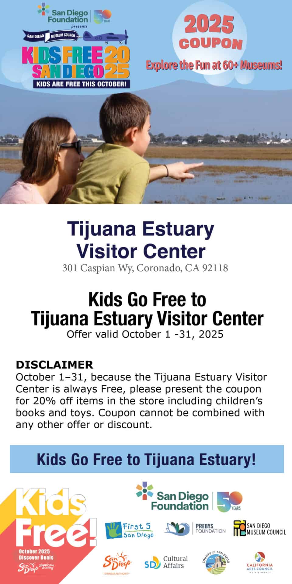 Disclaimer: October 1–31, because the Tijuana Estuary Visitor Center is always Free, please present the coupon for 20% off items in the store including children’s books and toys. Coupon cannot be combined with any other offer or discount.